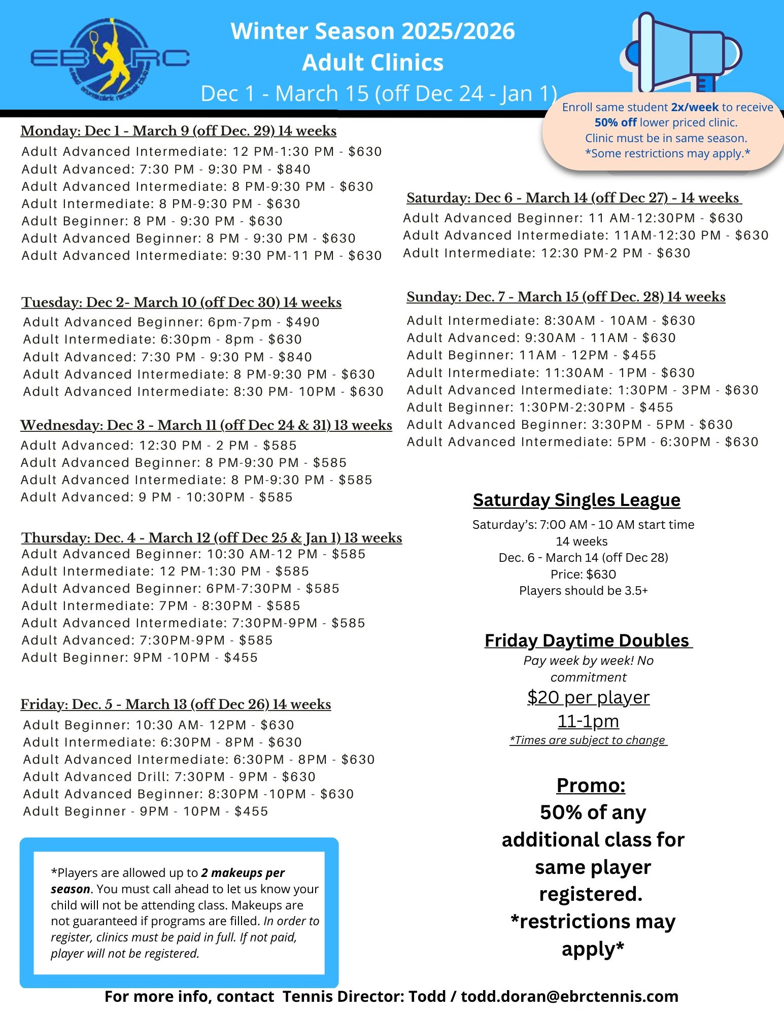 East Brunswick Racquet Club clinics are weekly group lessons for all ages and skill levels. We offer tennis clinics throughout the year, split up into four sessions per year. EBRC clinics run on a 6:1 player to coach ratio.