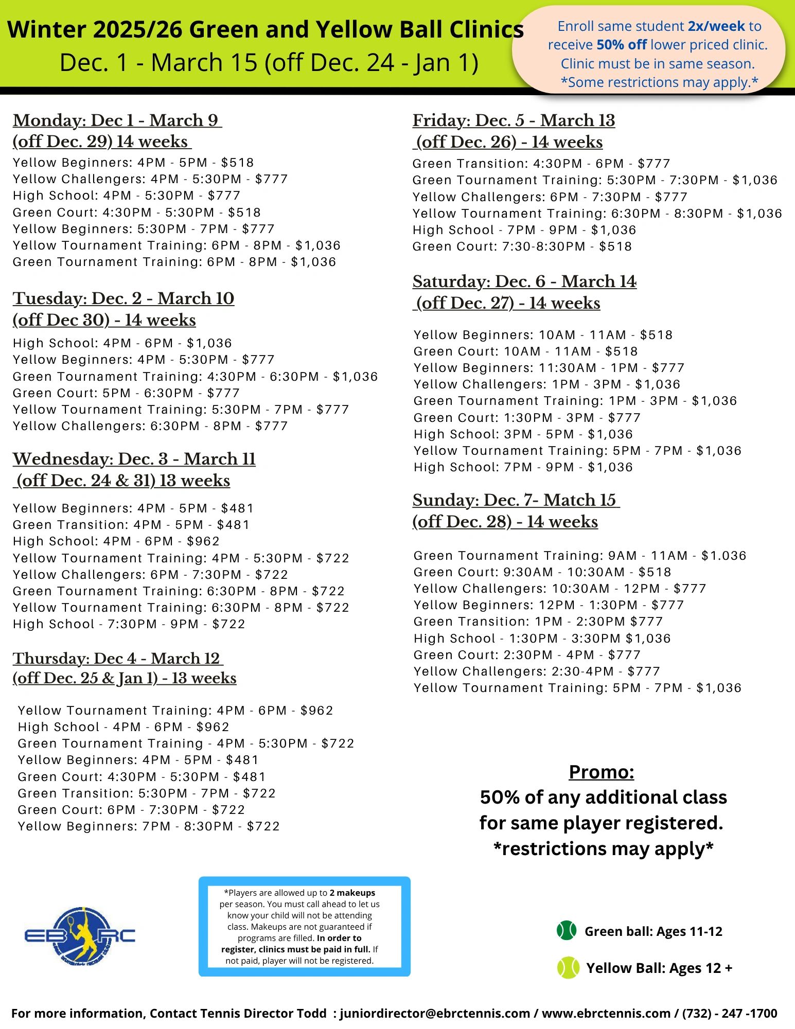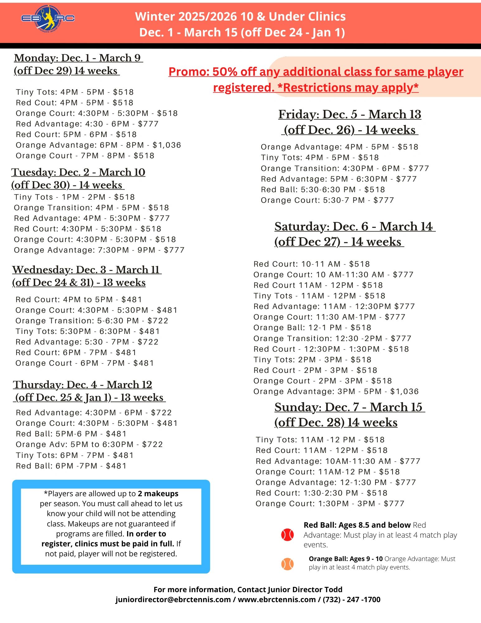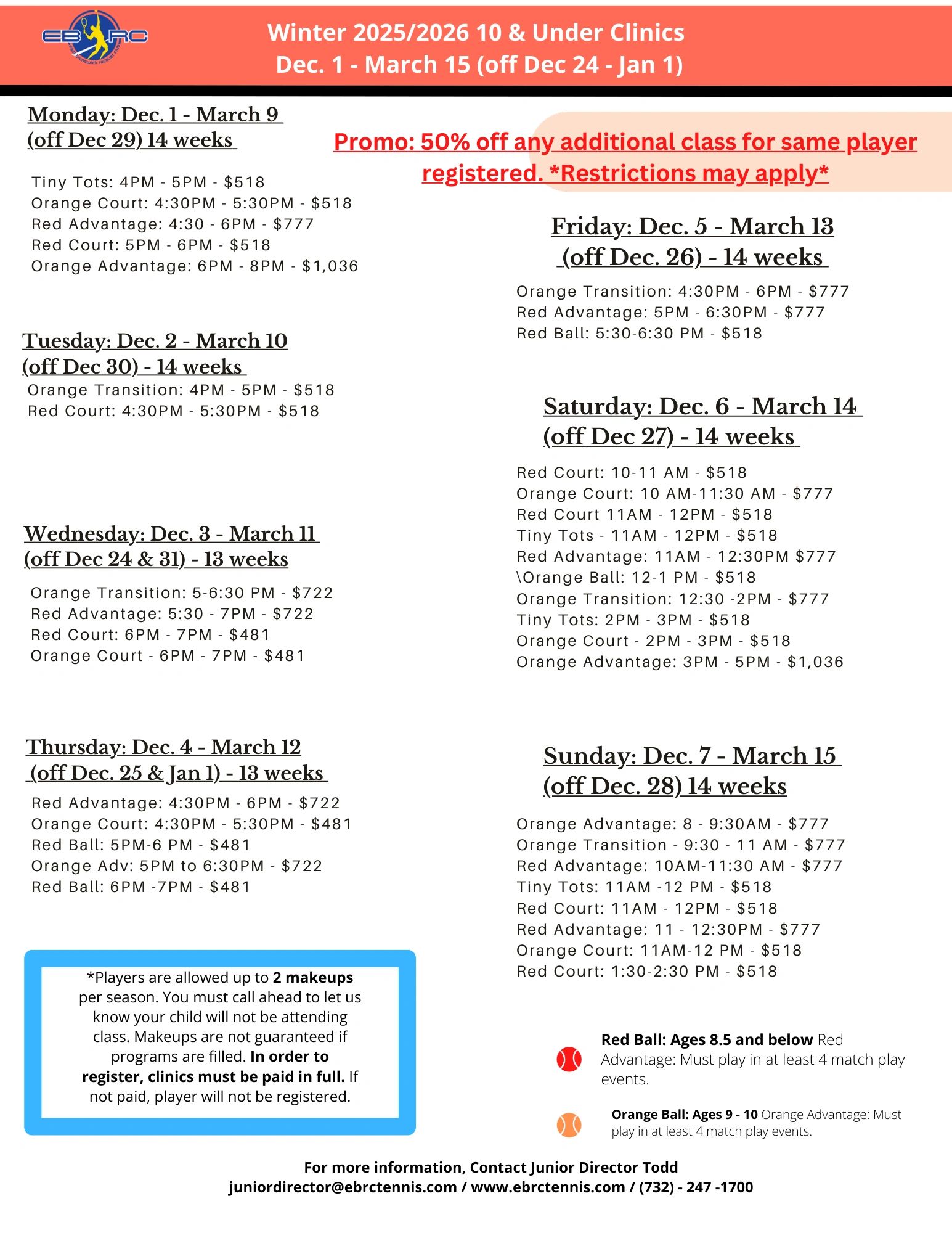 East Brunswick Racquet Club clinics are weekly group lessons for all ages and skill levels. We offer tennis clinics throughout the year, split up into four sessions per year. EBRC clinics run on a 6:1 player to coach ratio.