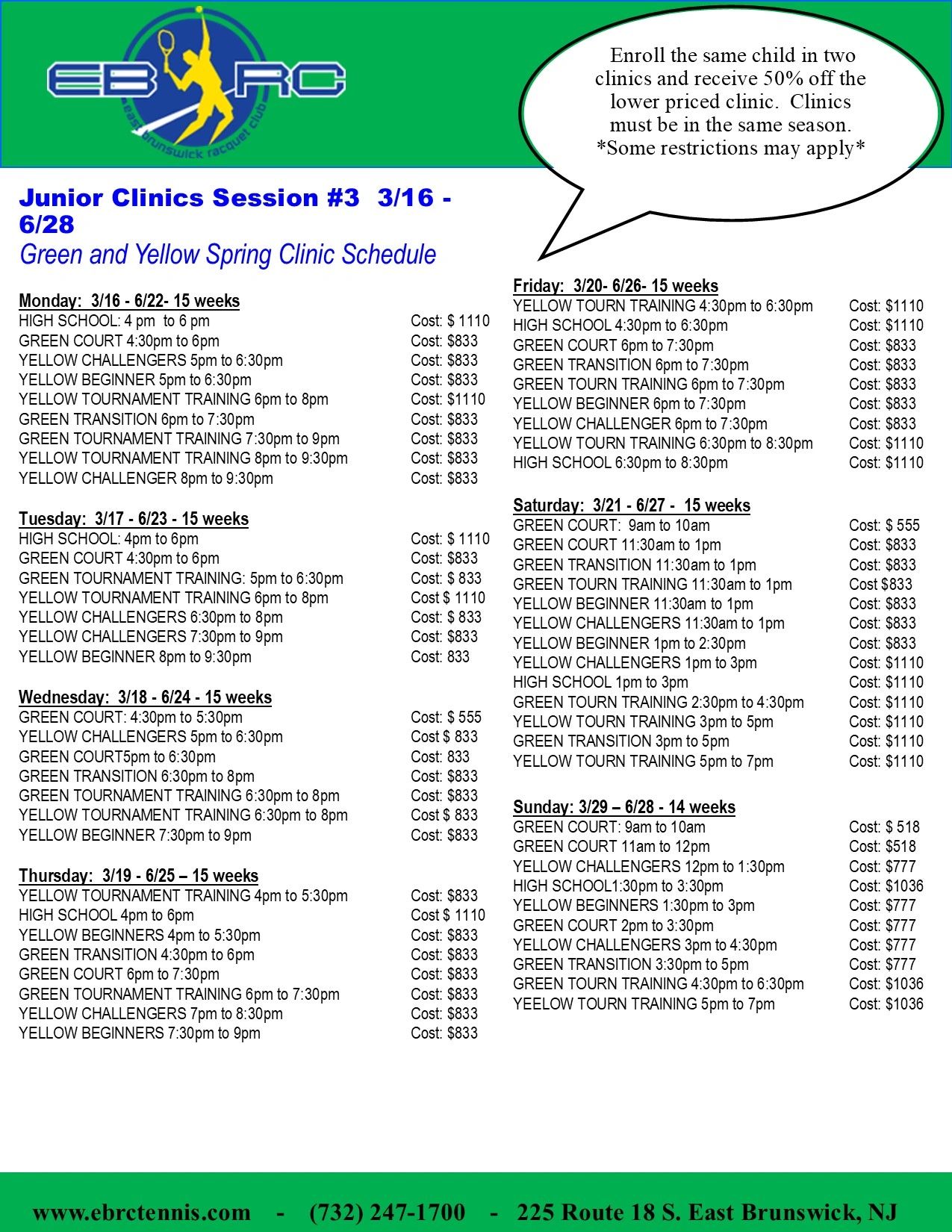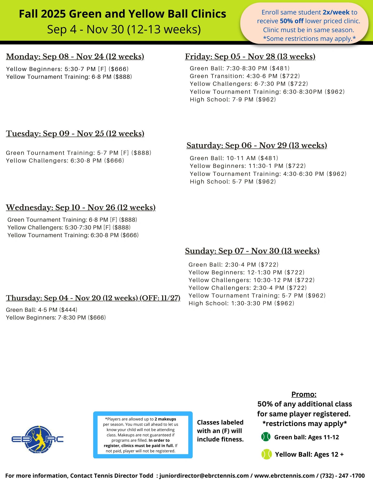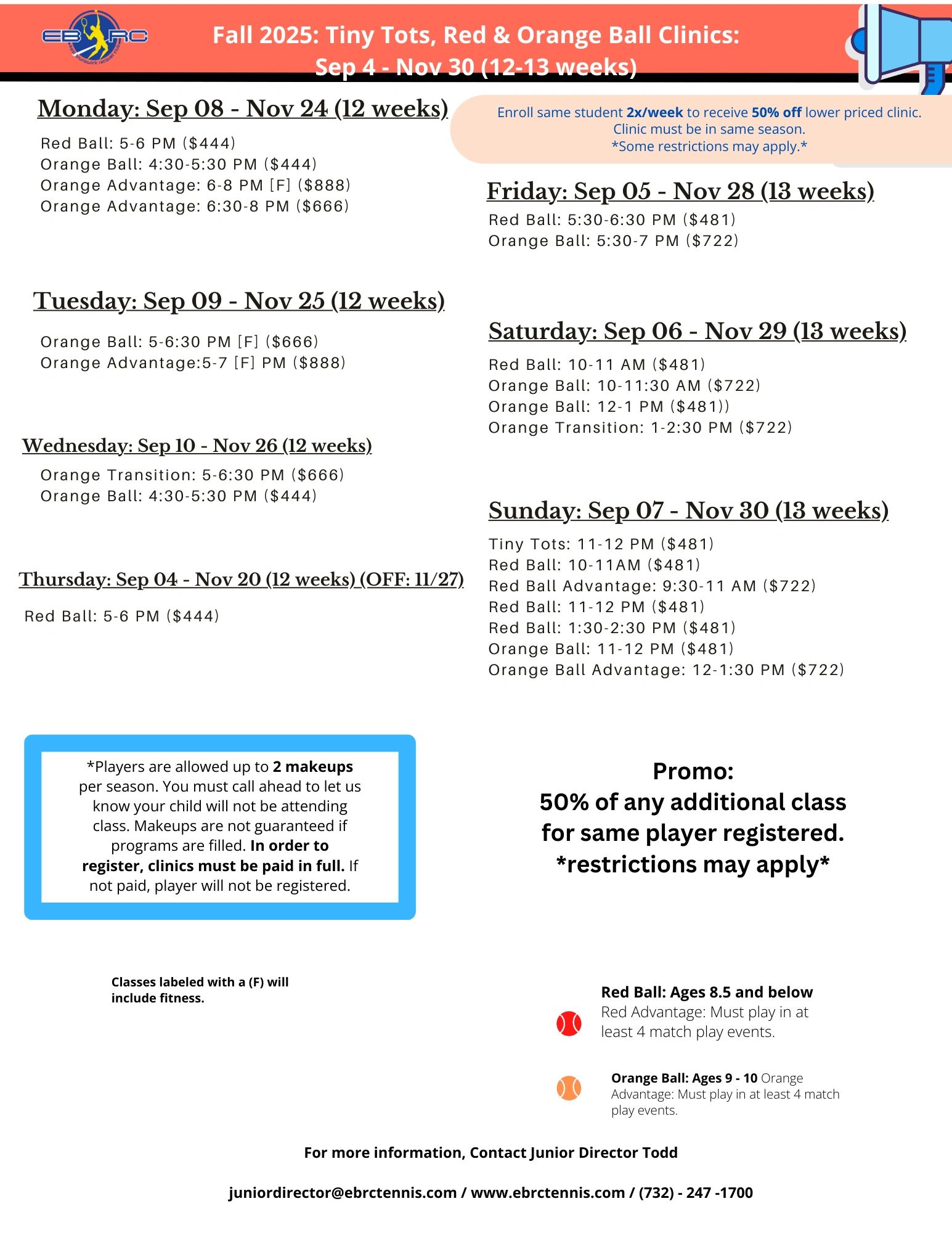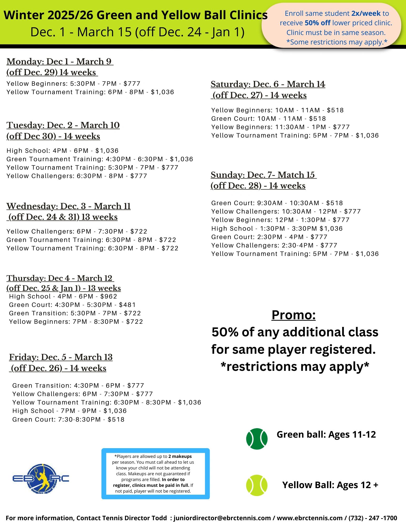 East Brunswick Racquet Club clinics are weekly group lessons for all ages and skill levels. We offer tennis clinics throughout the year, split up into four sessions per year. EBRC clinics run on a 6:1 player to coach ratio.